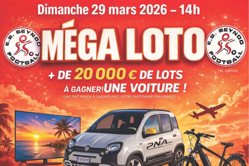 Méga Loto de l’E.S. Seynod Football : Une voiture à gagner et plus de 20 000 € de lots ! L’E.S. Seynod Football organise la 14ᵉ édition de son célèbre Méga Loto le dimanche 29 mars 2026. L’ouverture des portes se fera à 12h pour un coup d’envoi des parties à 14h, à la salle Cap Périaz (au-dessus de l’Auchan de Seynod). Au programme, plus de 20 000 € de lots ...