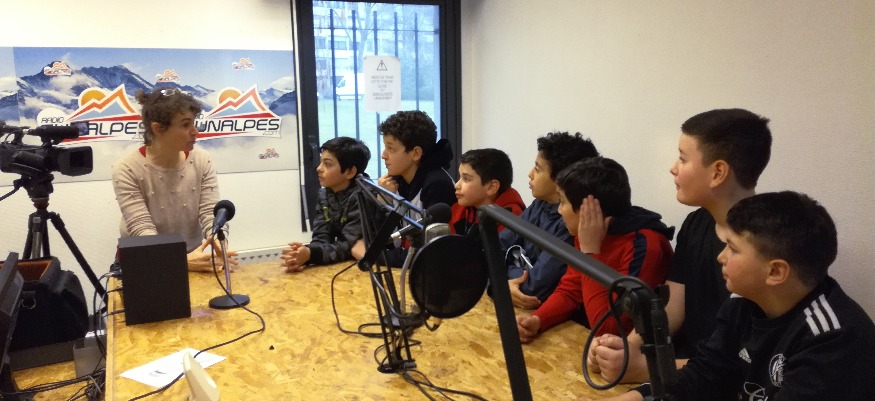 Photo : Les jeunes journalistes dans les studios de Sunalpes Radio devant la caméra de Seynod Mag.