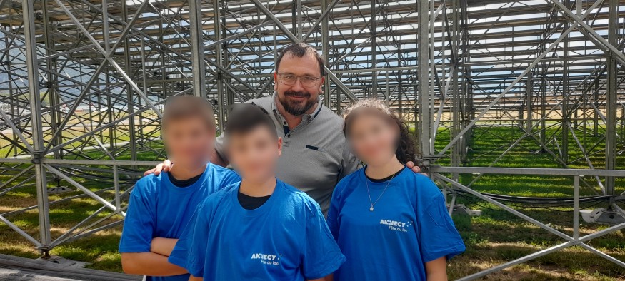 Photo : Christophe et les jeunes journalistes, aux pieds des tribunes de la Fête du Lac.